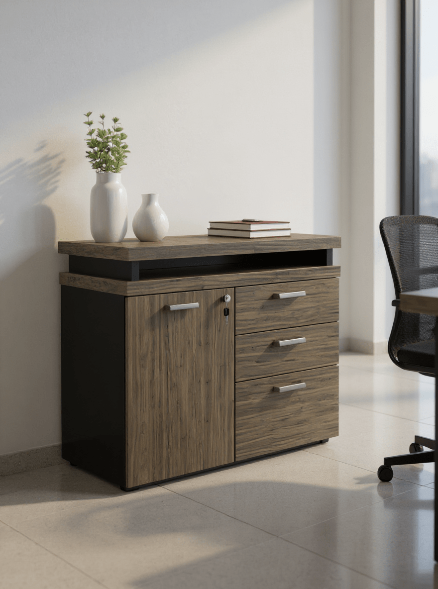 Ideal para organizar documentos, pastas, materiais de escritório e objetos pessoais, esse armário de madeira com prateleiras, gavetas e porta com fechadura garante segurança, conforto e eficiência no dia a dia.