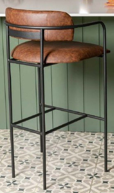 Com acabamento em couríssimo marrom claro e estrutura metálica preta, ela traz personalidade e sofisticação para cozinhas, áreas gourmet, cafés, recepções e espaços corporativos.