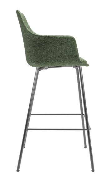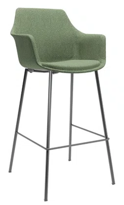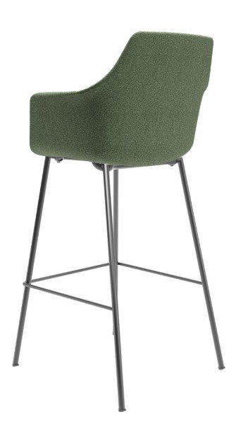 A base em aço com acabamento preto assegura estabilidade, resistência e durabilidade, criando um contraste elegante com o revestimento verde. Por ser um modelo fixo, a banqueta oferece firmeza e segurança, mantendo o ambiente organizado e funcional.