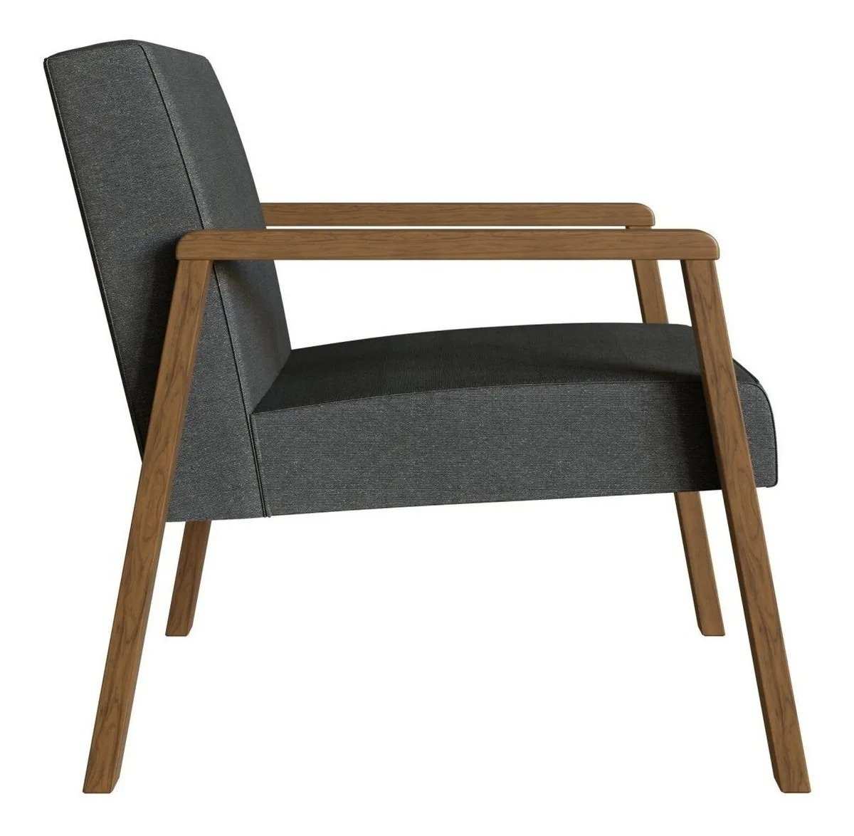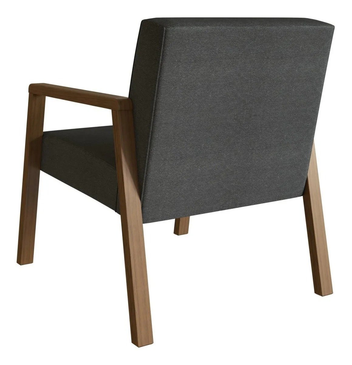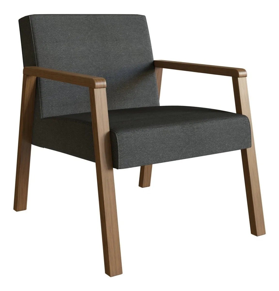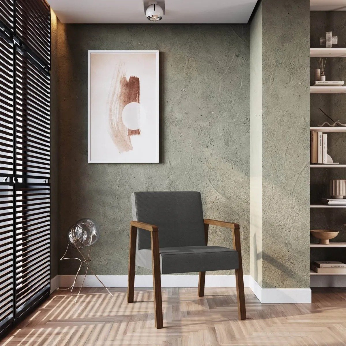 Seu assento estofado em espuma revestida em tecido proporciona conforto imediato e sensação de aconchego, enquanto o encosto almofadado oferece apoio macio e ergonômico para relaxar ou receber visitas. A combinação do estofamento chumbo com os detalhes em madeira nogueira cria um visual moderno, atemporal e fácil de harmonizar com diferentes estilos de decoração.