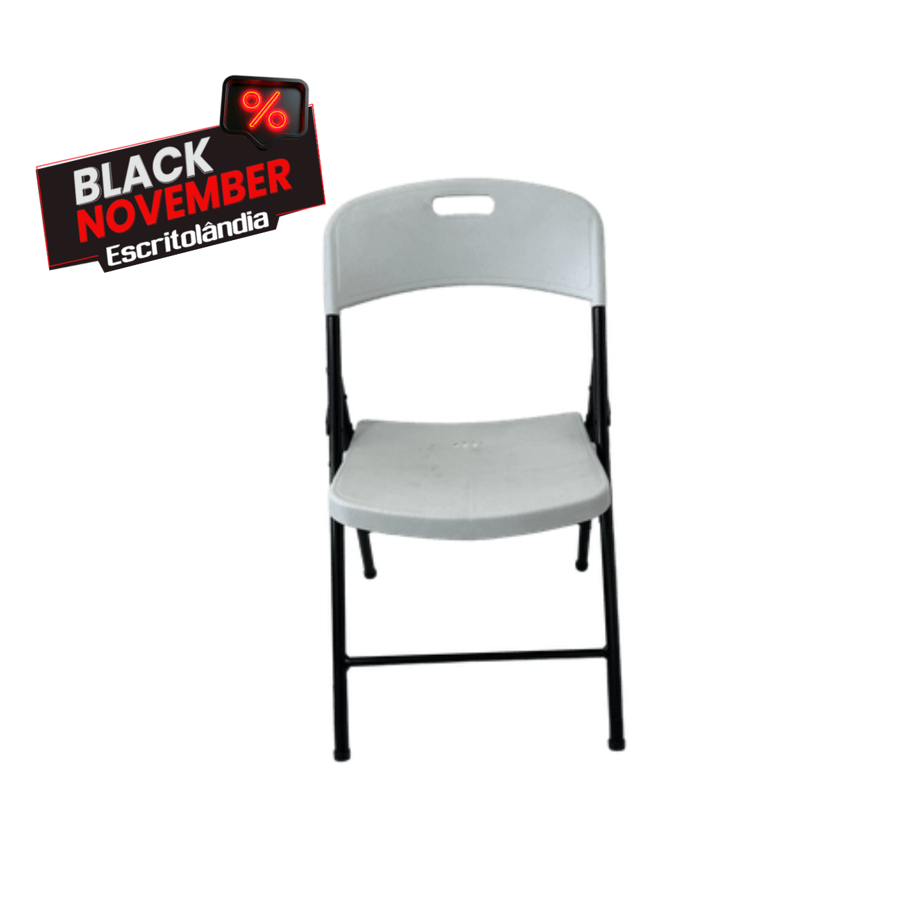 A Cadeira Dobrável Branca com Estrutura Preta em Aço Reforçado combina durabilidade, leveza e funcionalidade em um design moderno e prático.