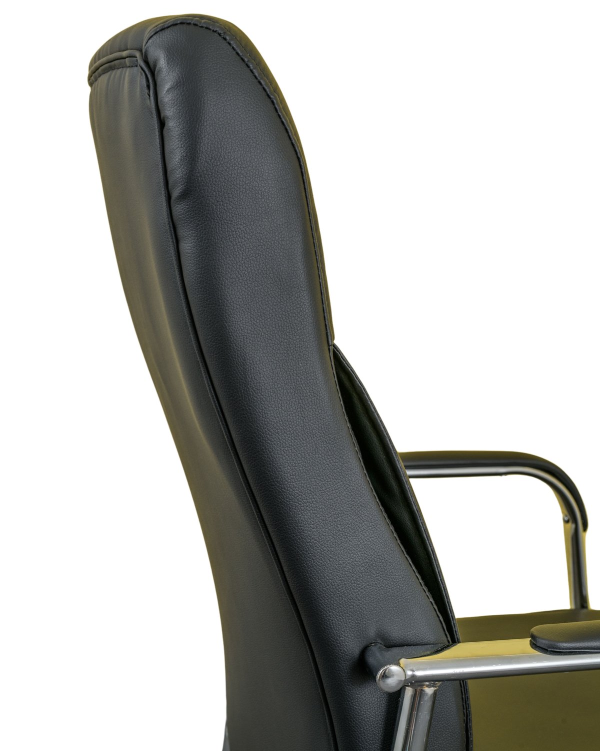 Com assento e encosto estofados em couríssimo de alta qualidade e espuma de alta densidade, proporciona suporte ergonômico e conforto prolongado. Os braços fixos cromados com apoio estofado agregam sofisticação, enquanto o encosto alto levemente inclinado garante postura adequada e apoio ideal para as costas.