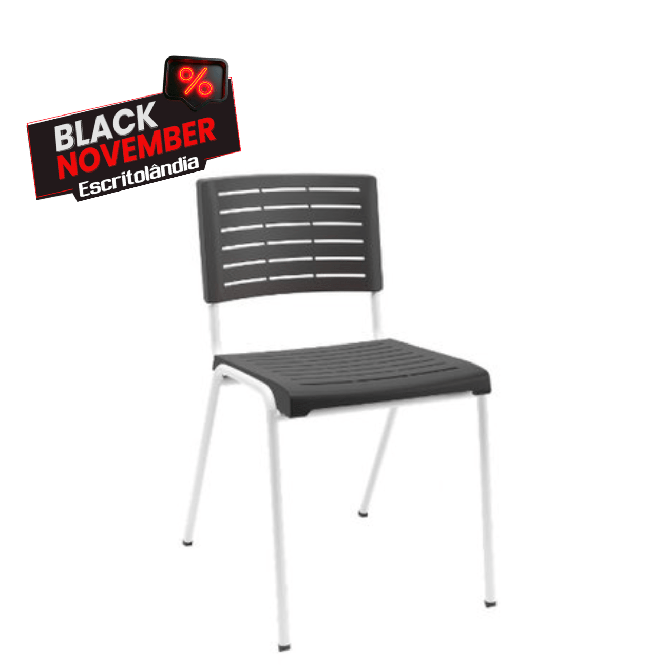 Com assento e encosto em termoplástico preto, a cadeira oferece conforto ergonômico, ventilação adequada e fácil limpeza, garantindo durabilidade e aparência sempre impecável.