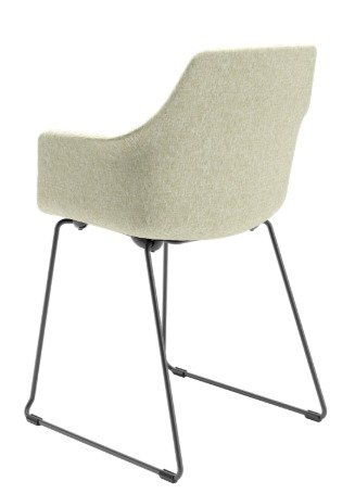 A base trapezoidal em aço com acabamento preto garante estabilidade, robustez e um contraste moderno com o estofamento claro. Os braços fixos revestidos em tecido complementam o conforto e reforçam a unidade visual do conjunto.
