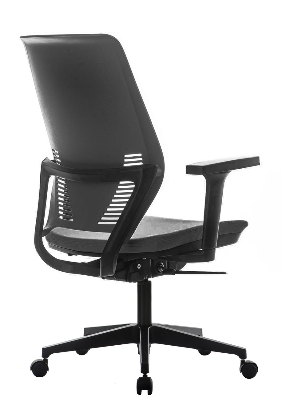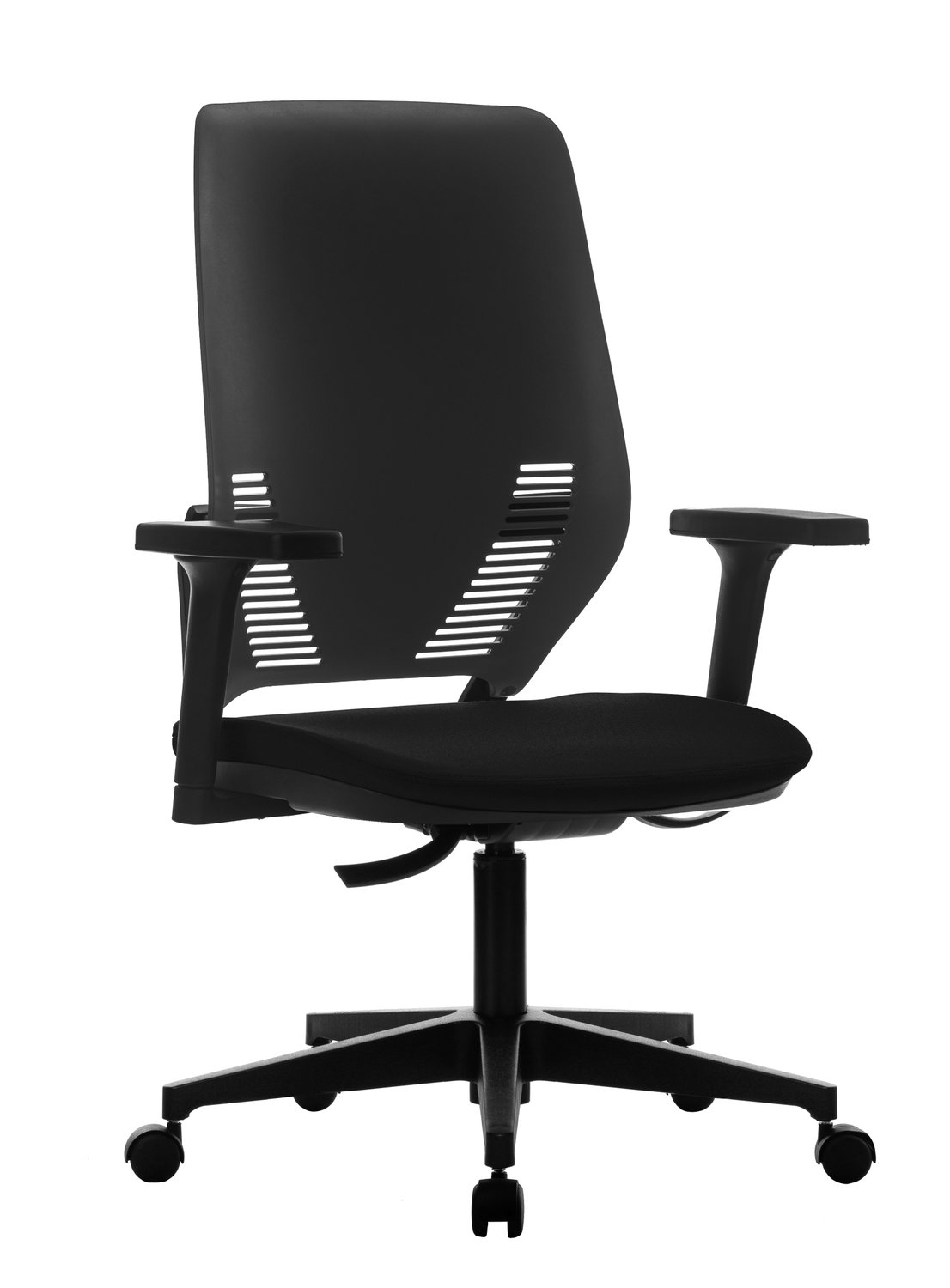 Equipada com mecanismo Back Slitta, possibilita regulagem de altura do assento e encosto, ajuste de profundidade de até 60 mm e retorno automático do assento por mola. Os braços em PU contam com regulagem em três posições (altura, avanço horizontal e giro), proporcionando adaptação completa às necessidades do usuário.