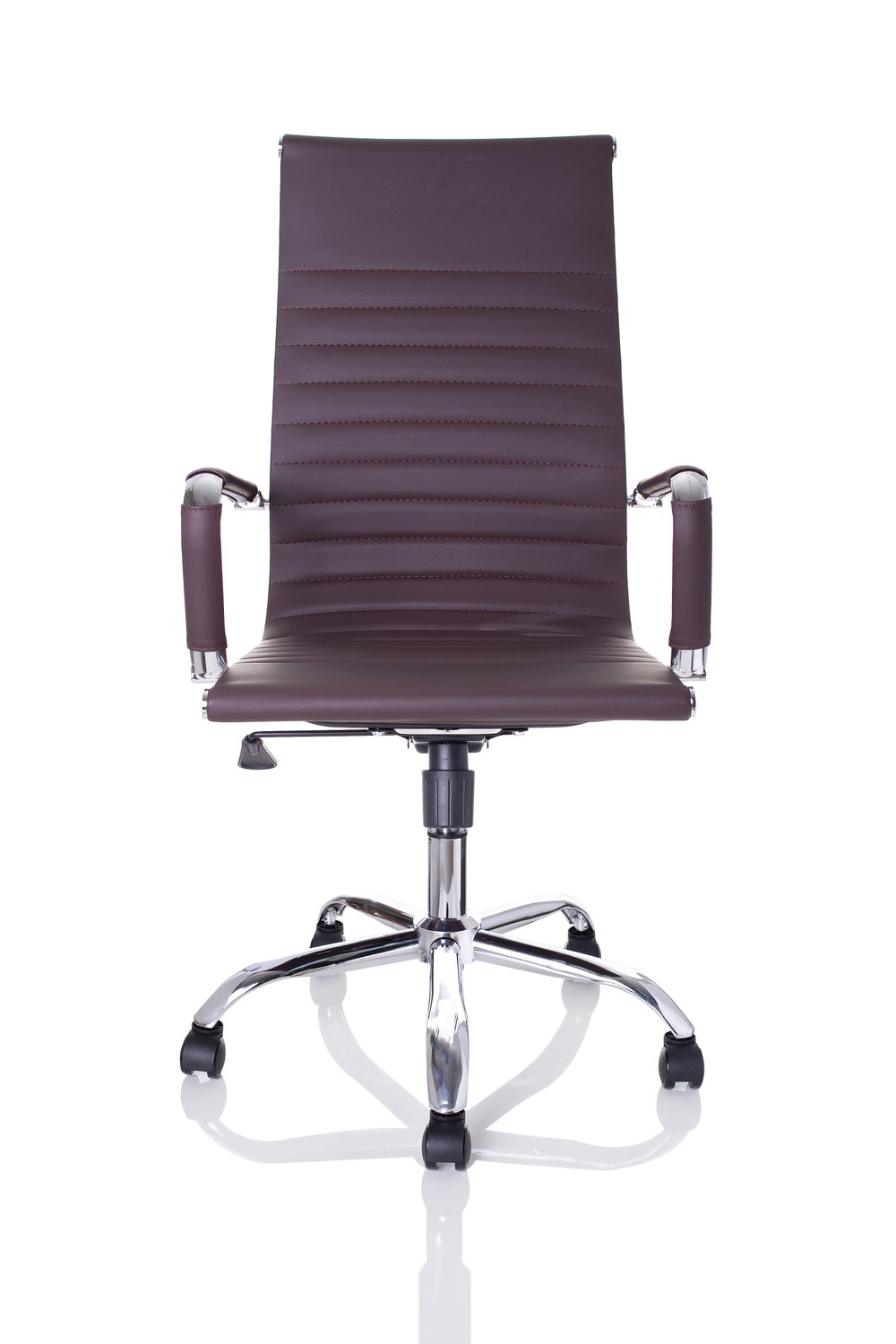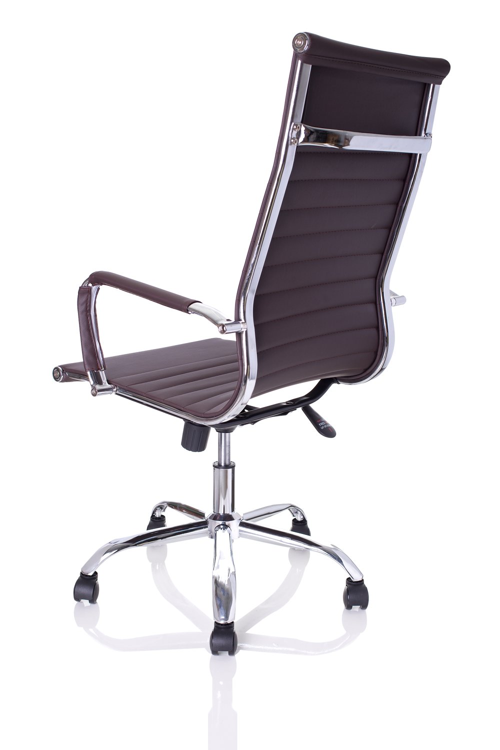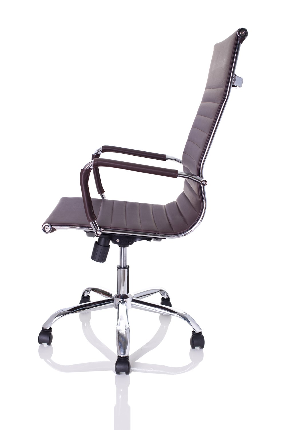 Estofada em couríssimo preto, a poltrona oferece toque macio, fácil manutenção e durabilidade superior. A estrutura cromada, aliada aos braços metálicos fixos com apoio confortável, reforça a resistência e o aspecto profissional da peça.