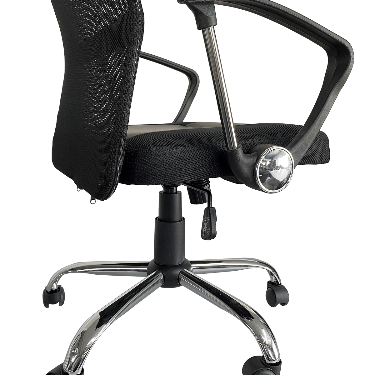 Projetada para garantir bem-estar durante longas jornadas, a cadeira conta com base cromada tipo aranha, rodízios em PU que deslizam suavemente e pistão cromado com regulagem de altura. Seus braços fixos proporcionam apoio extra, enquanto o revestimento em poliéster une resistência e conforto.
