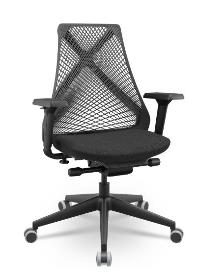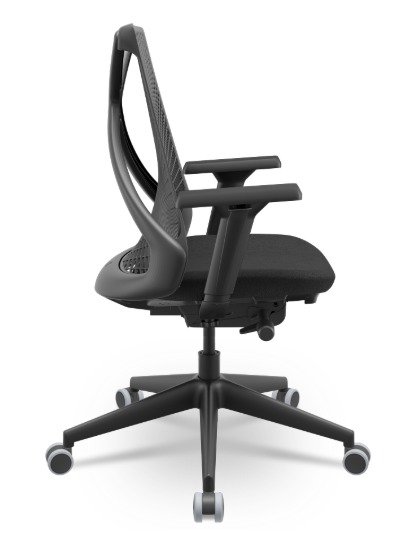 Equipada com mecanismo autocompensador, a cadeira permite ajuste sincronizado entre assento e encosto, regulagem de profundidade, altura e tensão de inclinação, entregando adaptação precisa a diferentes biotipos. Os braços 4D, com regulagem em altura, profundidade, rotação e avanço lateral, completam a ergonomia premium do modelo.