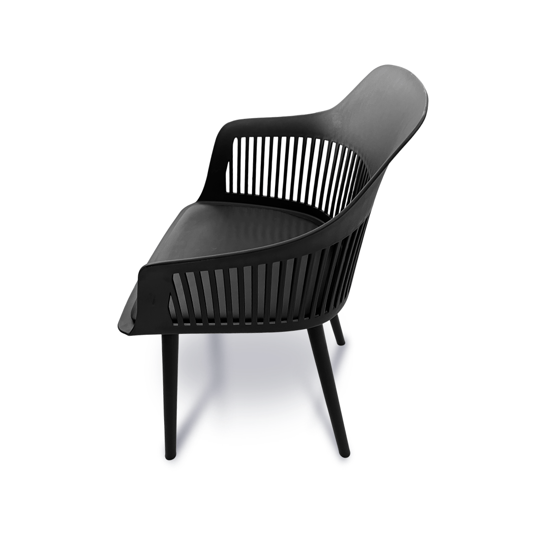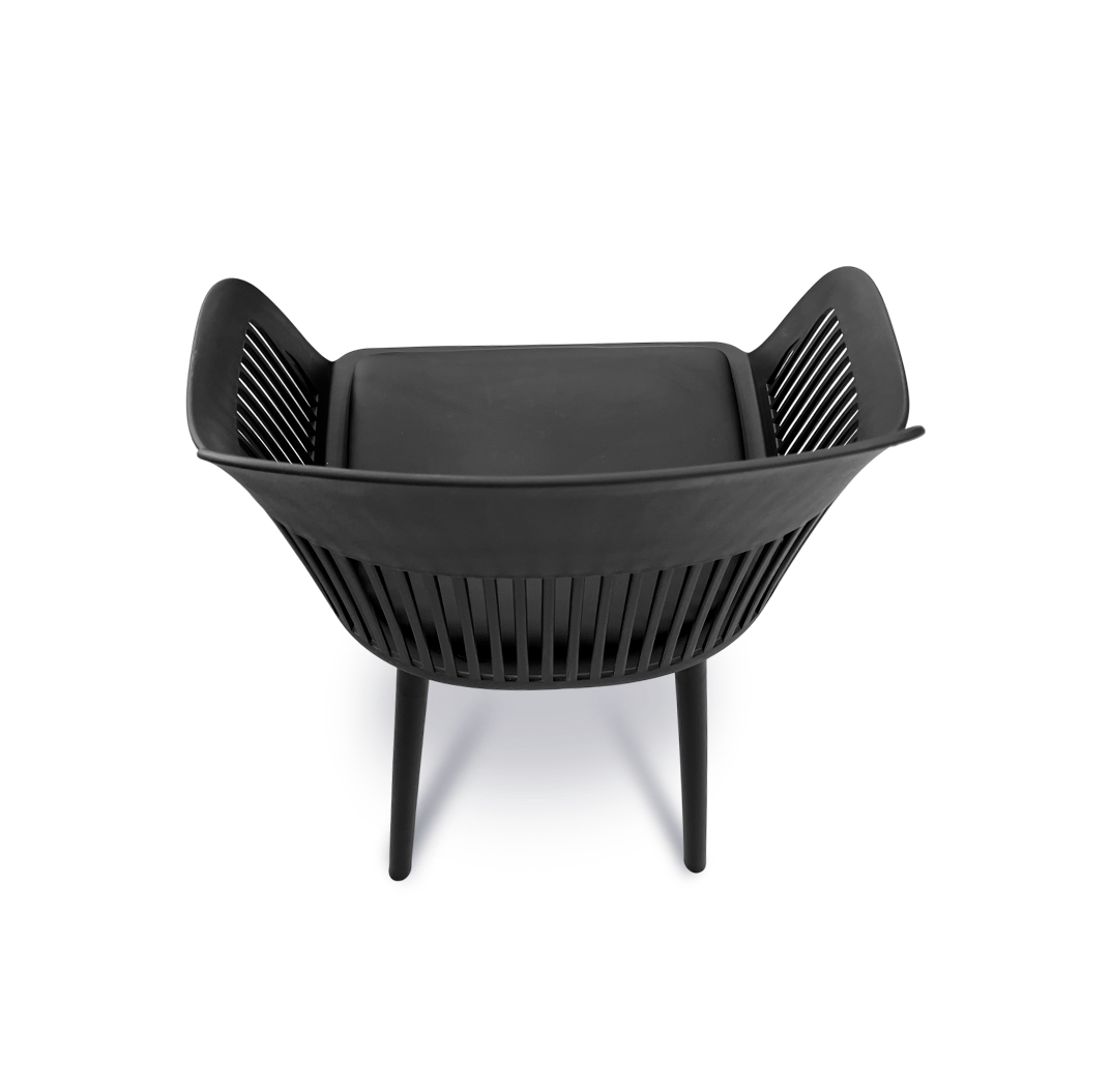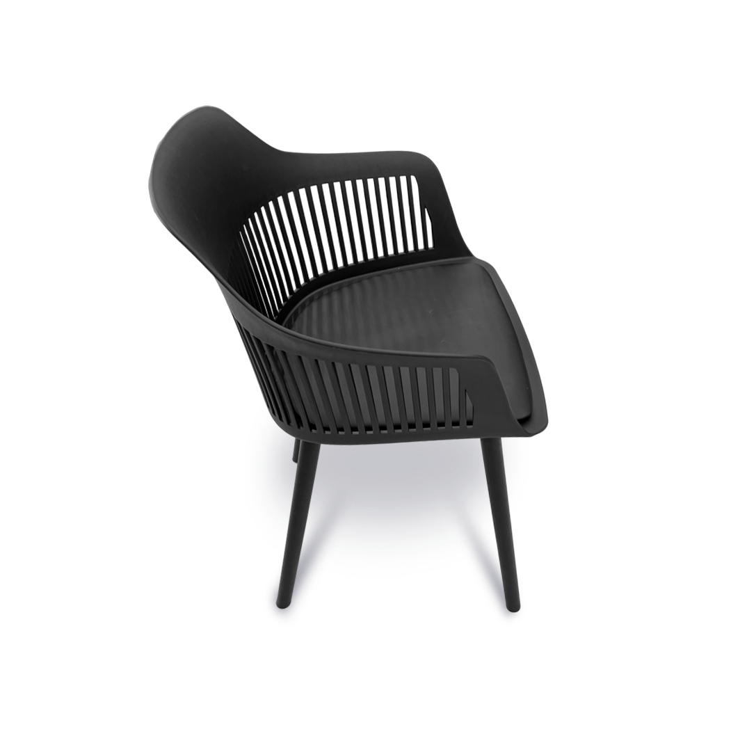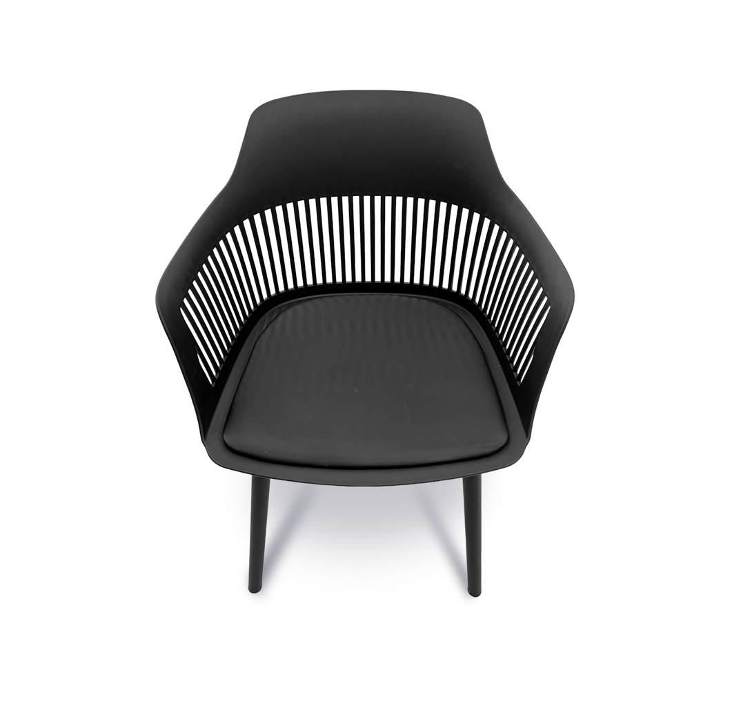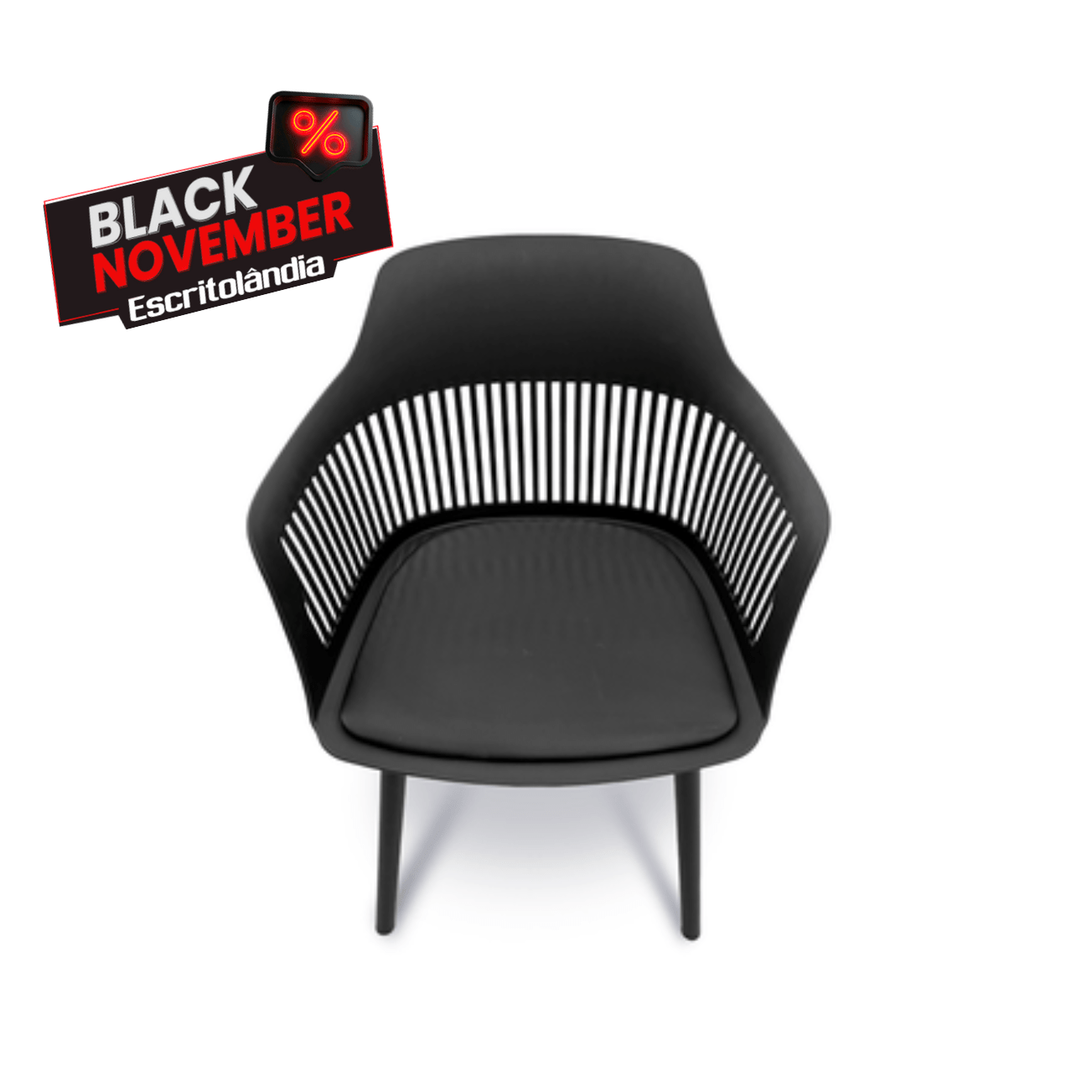 Seu encosto vazado em polipropileno traz leveza e ventilação, enquanto o assento estofado em couro ecológico (PU) garante um toque de sofisticação e conforto prolongado durante o uso diário.