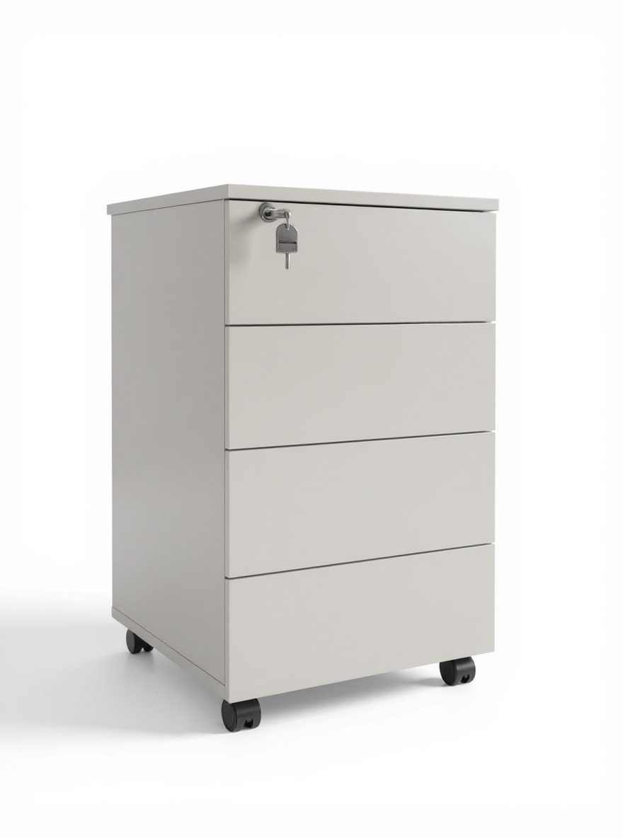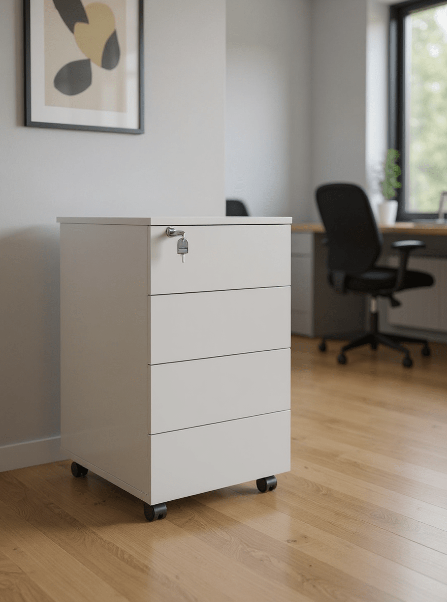 Organize seu ambiente de trabalho com praticidade e elegância utilizando o Gaveteiro Volante 4 Gavetas com Chave e Rodízios. Produzido em MDP de alta resistência e acabamento sofisticado em borda PVC, ele é perfeito para quem busca durabilidade, funcionalidade e segurança no escritório ou home office.